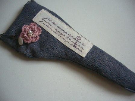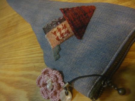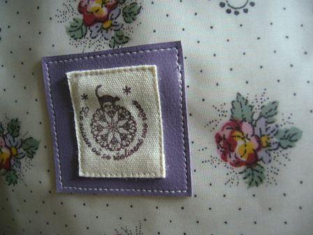 紫の合成皮革にはんこのタグをのせて、ワンポイントにしました